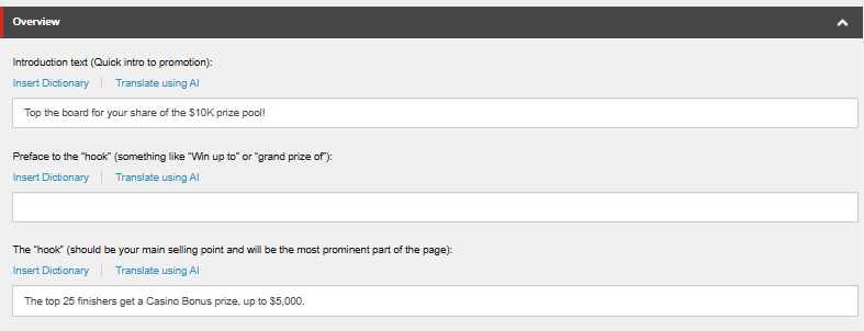 If the ticket is a Leaderboard Promotion, there is a slight change in the inputs in the How It Works Tab. Instead of the bolded text for the title, it will be replaced with SVG items. Below is the sample Leaderboard PAT promotion.