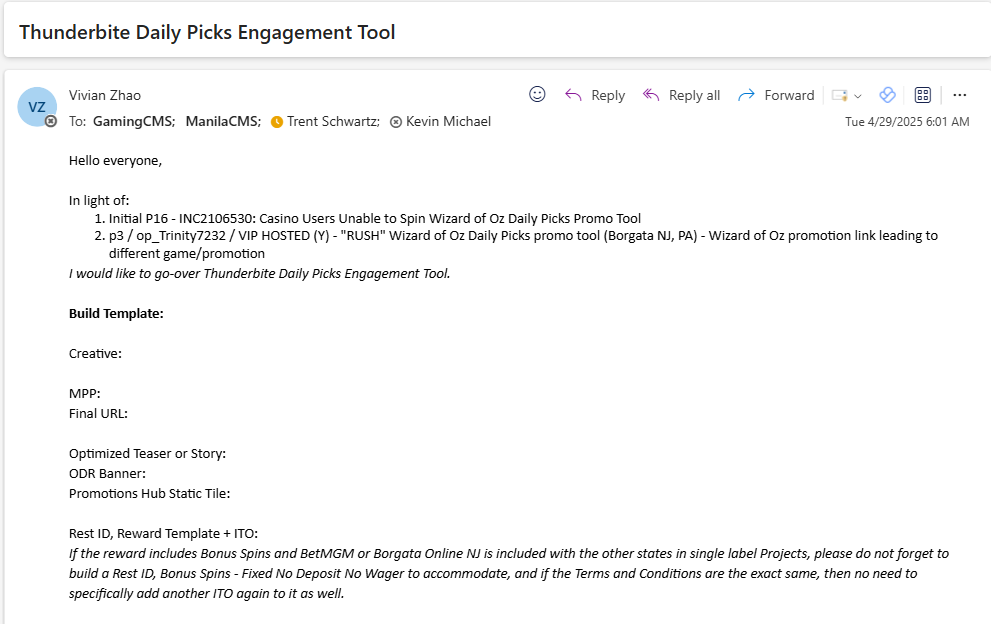 If the reward includes Bonus Spins and BetMGM or Borgata Online NJ is included with the other states in single label Projects, please do not forget to build a Rest ID, Bonus Spins - Fixed No Deposit No Wager to accommodate, and if the Terms and Conditions are the exact same, then no need to specifically add another ITO again to it as well.