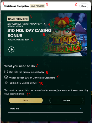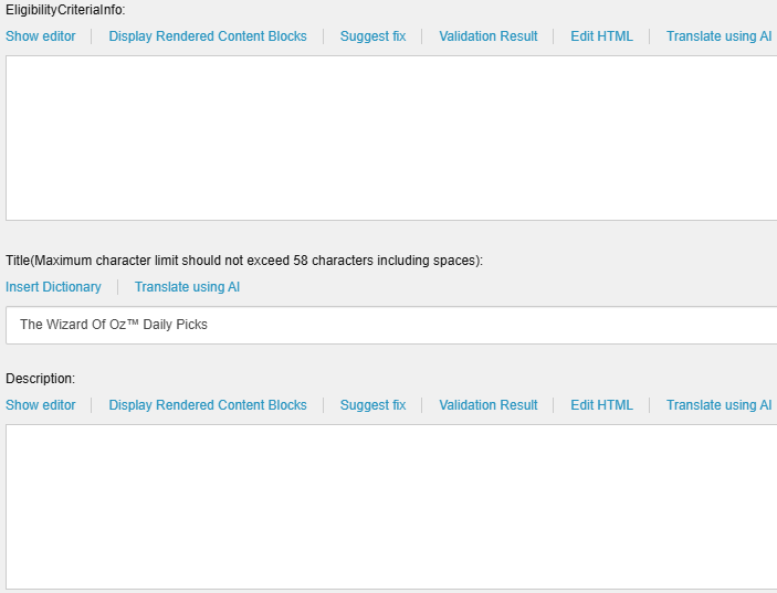 Both EligibilityCriteriaInfo and Description can be blank, but please source the Title from either the Copy's PROMO HUB KEY TERMS > H1 or Copy's name of the featured game, so in this case, it is the latter: